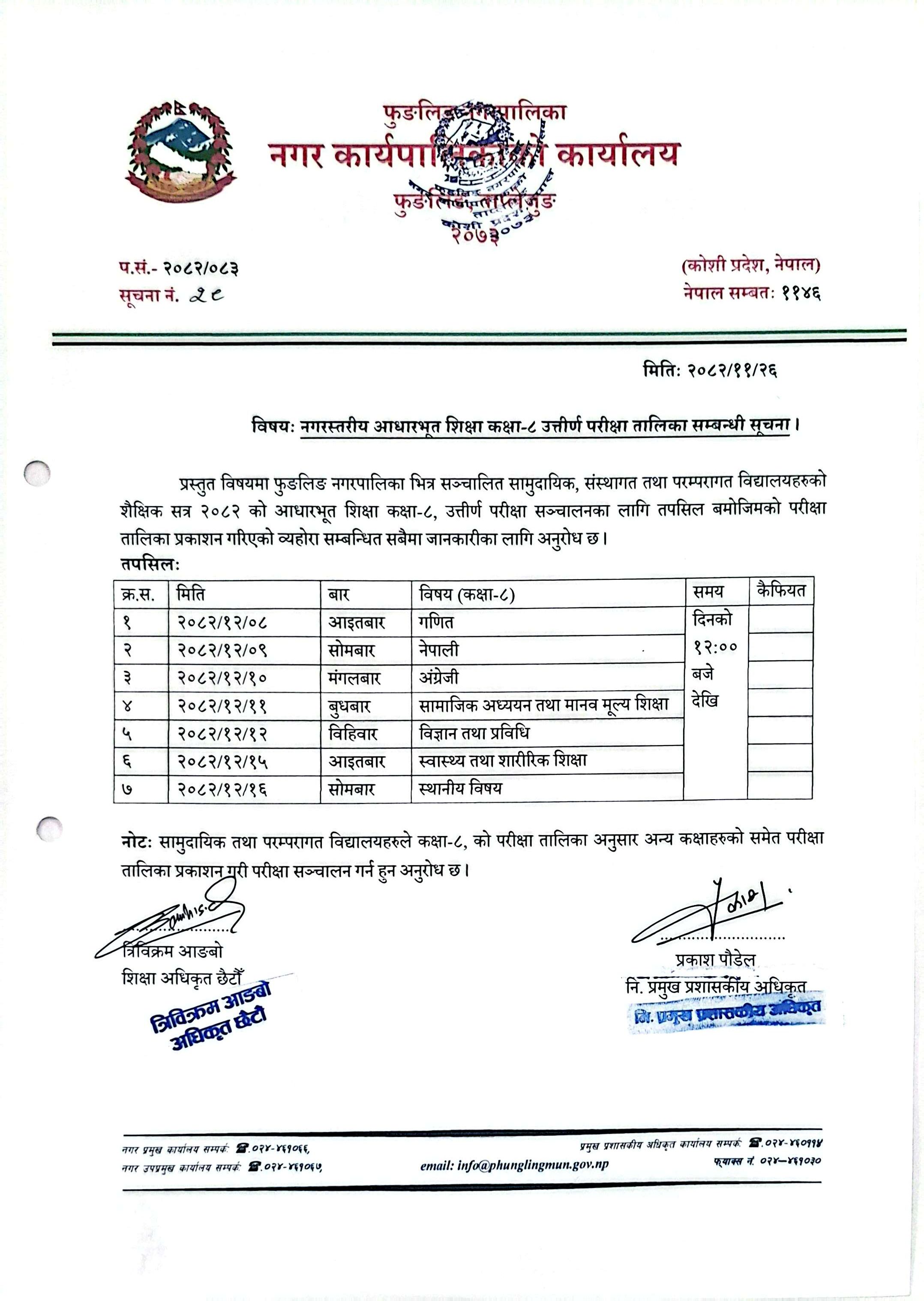 Home » नगरस्तरीय आधारभूत शिक्षा कक्षा-८ उत्तीर्ण परीक्षा तालिका सम्बन्धी सूचना!!!!!